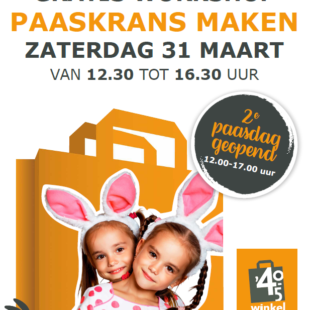 Op zaterdag 31 maart staat winkelcentrum Plein ’40-’45 in het teken van Pasen. Komt u ook uw paasinkopen doen? De (aller)kleinste kunnen een prachtige paaskrans maken op het Plein ’40-’45 paasterras. Een creatieve activiteit, waarbij het eindresultaat vrolijk op de paastafel kan pronken. Natuurlijk is deze workshop gratis. De workshop vindt plaats op zaterdag 31 maart van 12:30-16:30 uur. Bent u er ook bij?